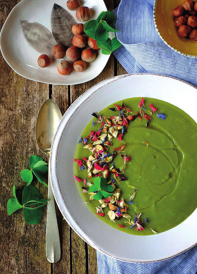 Vellutata di pratolina e acetosella 4Tostate le nocciole in un tegame d’acciaio a fuoco altro, agitandole continuamente, poi tritatele al coltello. Versate la vellutata nei piatti, condite con un filo d’olio a crudo e guarnite con le nocciole e con i fiori.