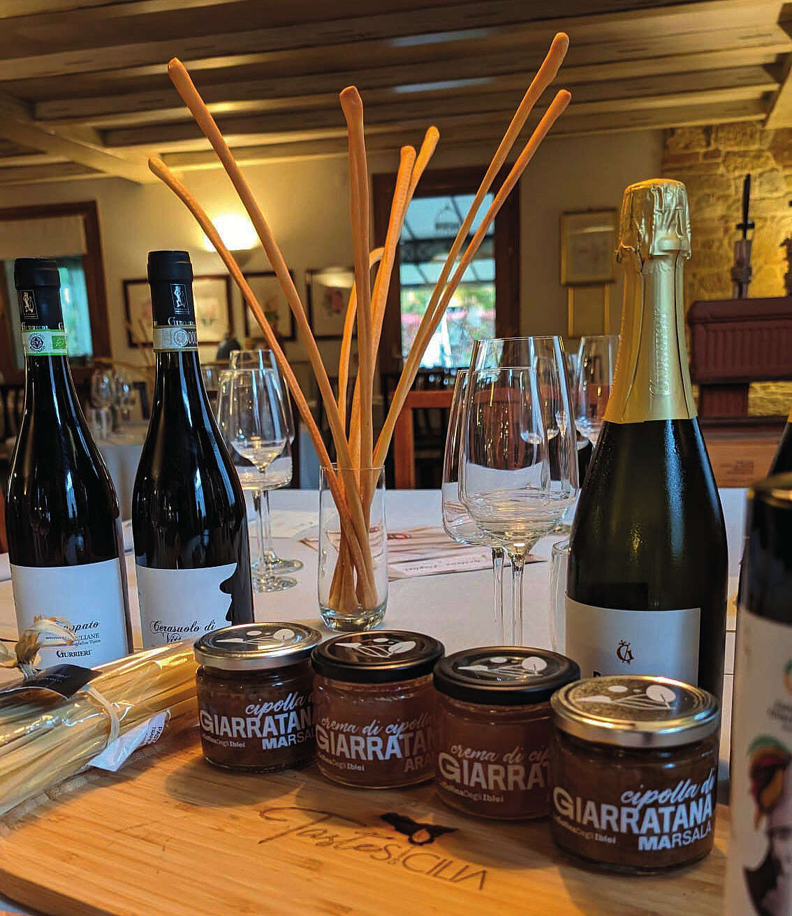 - Primo piatto: Tagliatelle di semola di grano duro siciliano Terramatta Pasta Puglisi con capuliato, Conserve Iacono finocchietto selvatico, salsiccia chiaramontana, cipolla di Giarratana, Ragusano DOP, ricotta, croccante di guanciale di maialino nero siciliano, zafferano degli Iblei e mandorla di Licodia Eubea, accompagnate da Frappato - Cantine Gurrieri.