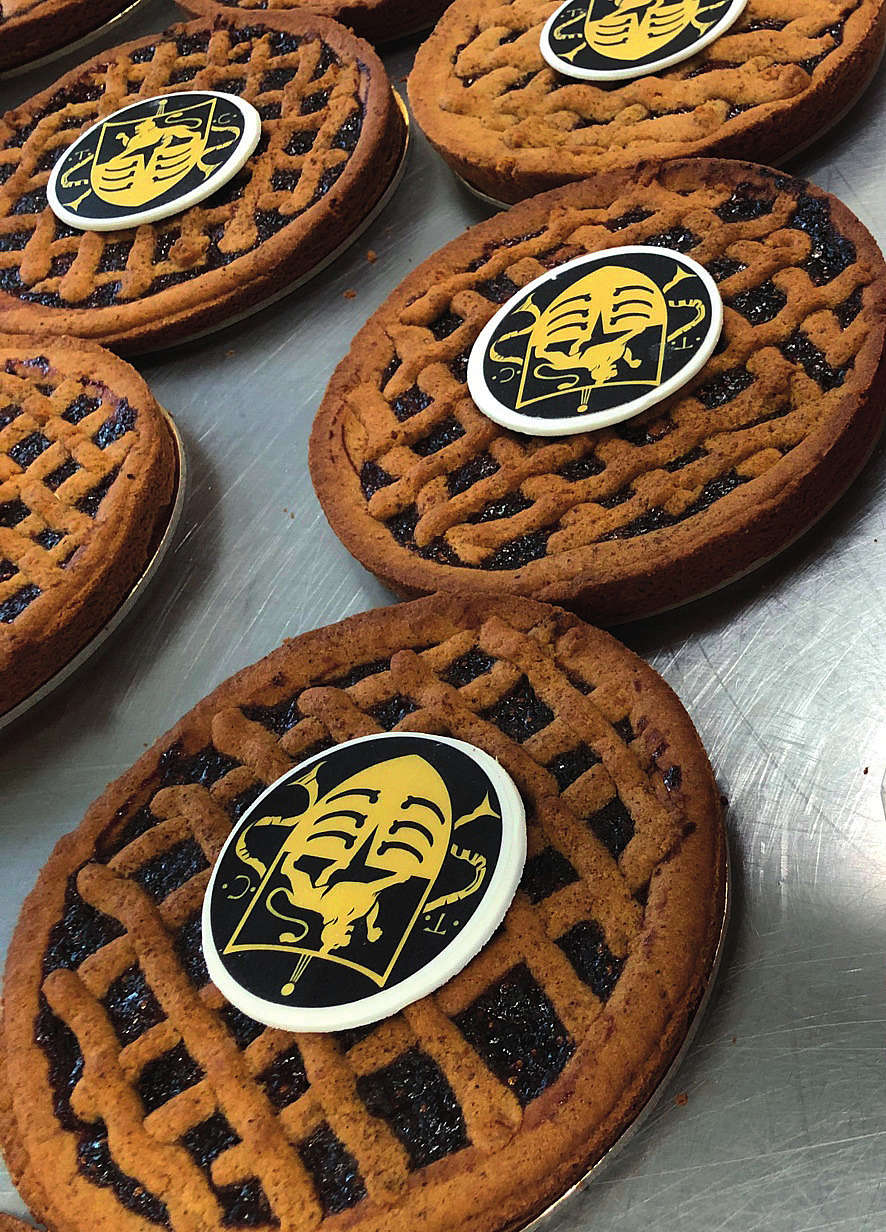 La frolla è un impasto tipo viennese di farina di cinquantino montata con burro, zucchero e mandorle. Si aggiungono anice stellato, cannella, noce moscata e ginepro in bacche. La marmellata di more viene cotta con zucchero e pasta di mele per dare consistenza. Con la sache a poche si distribuisce l’impasto nella teglia. Si versa la marmellata e poi si decora il tutto con striscioline di pasta. Grattugiata finale di pepe (già presente nella marmellata). Cottura in forno a 180° per 40’.