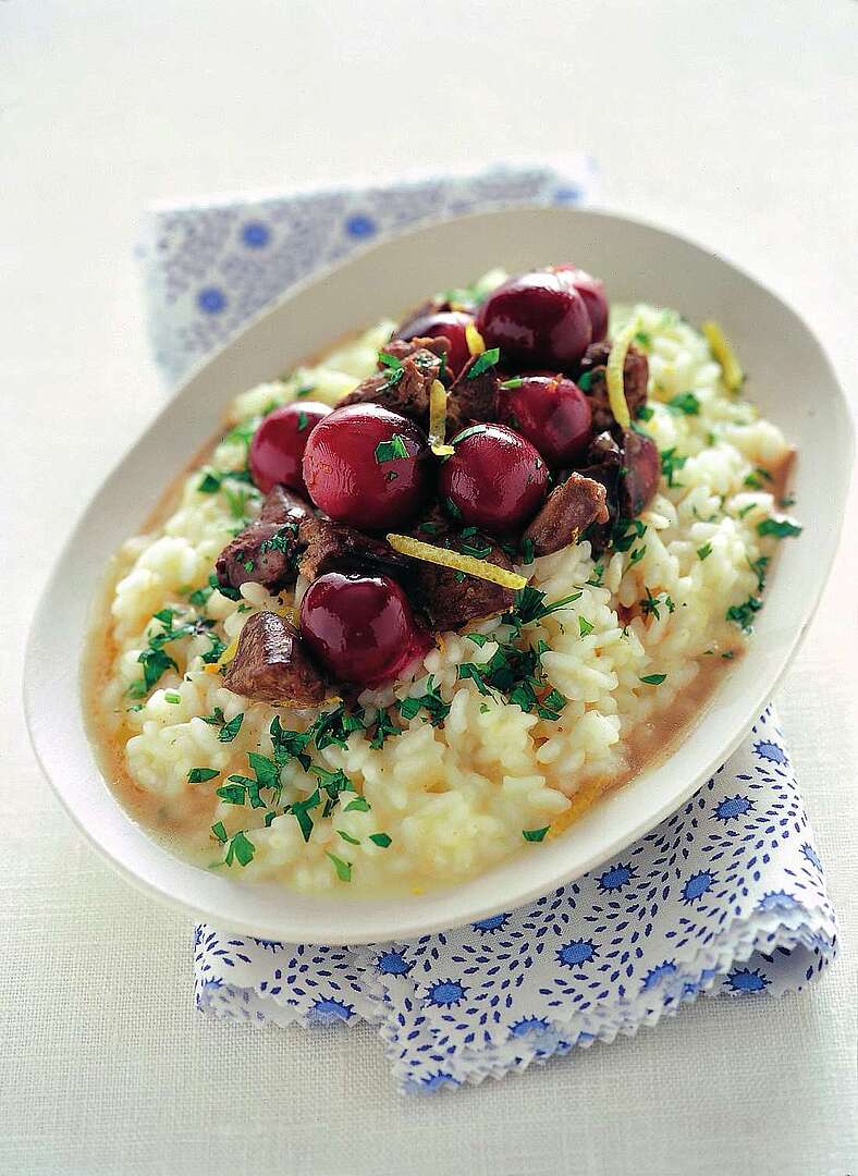 250 gr riso carnaroli; 200 gr uva rosata; 200 gr manzo scamone; 40 gr parmigiano; 1 cipolla; 1 limone; 1 spicchio aglio; 1 rametto rosmarino; 1 cucchiaio prezzemolo; 1.5 bicchieri vino bianco; q.b. brodo vegetale; q.b. burro; q.b. olio di oliva; q.b. sale; q.b. pepe