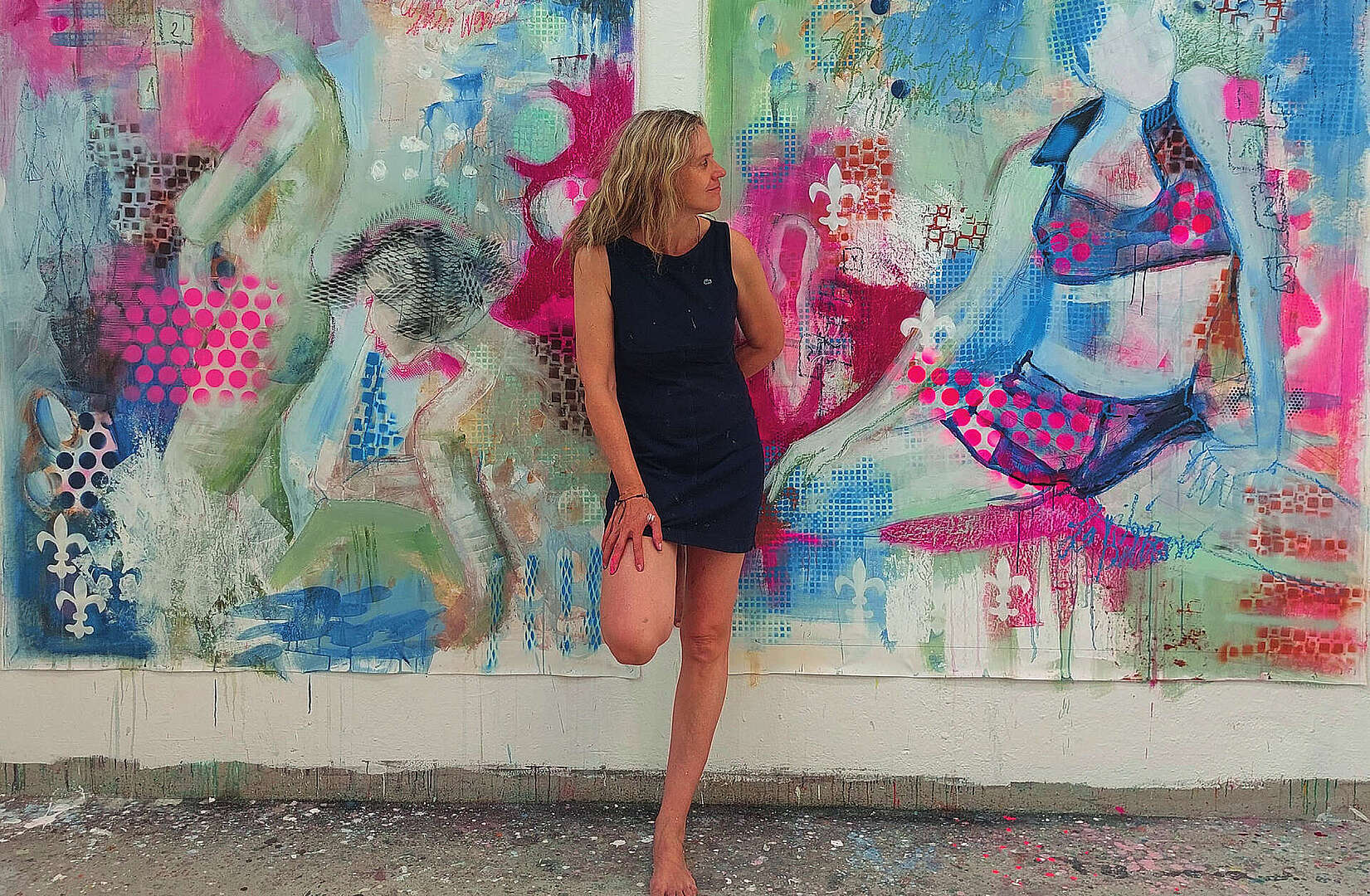 Dipinge quadri su tela utilizzando una tecnica mista di colori acrilici, spray e pastelli a olio. Mi piace dipingere in formati XXL, tele così grandi che i corpi che disegna hanno quasi le stesse dimensioni della realtà e usa i pastelli a olio con più vigore e fermezza. Anche i quadri più piccoli li dipinge su tele di grandi dimensioni tagliandoli in seguito per mantenere la forza e leggerezza della linea e della pennellata.